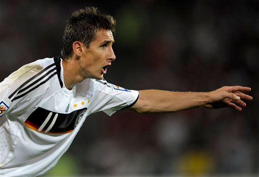 Germany's Miroslav Klose gestures during the World Cup group 4 qualifying match between Germany and Azerbaijan in Hanover, northern Germany on Wednesday Sept. 9, 2009. (AP Photo/Axel Heimken) ** Eds note: German spelling of Hanover is Hannover ** ASSOCIATED PRESS