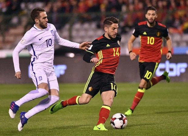 Belgium's Dries Mertens, center, is chased down by Greece's Kostas Fortounis, left, during the Euro 2018 Group H qualifying match between Belgium and Greece at the King Baudouin stadium in Brussels on Saturday, March 25, 2017. (AP Photo/Geert Vanden Wijngaert) AP