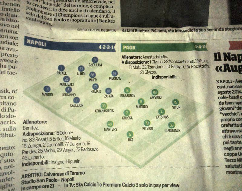 Στο ρεπορτάζ αναφέρεται, ακόμη, η ενδεκάδα που θα προτιμήσει ο Ράφα Μπενίτεθ κόντρα στον ΠΑΟΚ. Σε σχηματισμό 4-2-3-1, λοιπόν, ο Ράφαελ θα βρίσκεται κάτω από τα γκολπόστ, δεξιά ο Μάτζιο, αριστερά ο Γκουλάμ, στόπερ θα είναι οι Κουλιμπαλί και Αλμπιόλ, αμυντικά χαφ οι Ζορζίνιο και Ινλέρ, η τριάδα πίσω από τον σέντερ φορ θα αποτελείται από τον Μέρτενς (αριστερά), τον Καγεχιόν (δεξιά) και τον Χάμσικ (δεκάρι) και φουνταριστός θα αγωνιστεί ο Ζαπάτα.