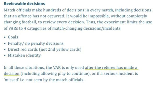 Το IFAB, το συμβούλιο που από τον 19ο αιώνα είναι ο μόνος αρμόδιος οργανισμός για τους κανονισμούς του ποδοσφαίρου, έχει ενημερώσει εξ αρχής ότι η χρήση VAR γίνεται αποκλειστικά σε 4 περιπτώσεις που αλλάζουν τη ροή του αγώνα.