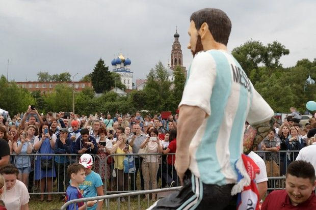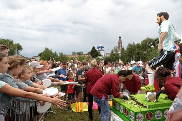 People gather around a sculpture cake to mark Lionel Messi's birthday near Argentina training camp base at the 2018 World Cup in Bronnitsy, Russia, Sunday, June 24, 2018. Wth a cake sculpture and a music festival the town of Bronnitsy celebrated the striker's 31st birthday.(AP Photo/Ricardo Mazalan)