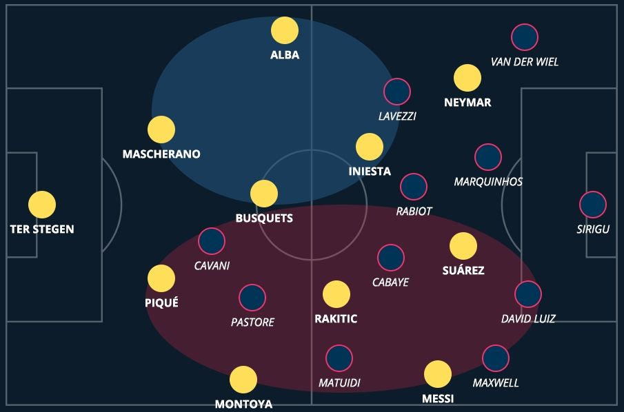 Ο Κροάτης μέσος, πολυεργαλείο ολκής που στην επίθεση είναι εκείνος ο μέσος που πατάει στην αντίπαλη περιοχή, καλύπτει τα νώτα του Αργεντινού συμπαίκτη του από τη δεξιά πλευρά, ενώ στην αριστερή, ο Νεϊμάρ που διαθέτει περισσότερες δυνάμεις και μεγαλύτερη αμυντική προσήλωση, εργάζεται ανασταλτικά από το κέντρο, όταν η Μπαρτσελόνα δεν έχει την κατοχή της μπάλας. Το αποτέλεσμα είναι ένα… κεκλιμένο 4-4-2, με παίκτες που άλλες φορές είναι έτοιμοι να μαρκάρουν τη στιγμή της απώλειας της μπάλας για να την ανακτήσουν σε δευτερόλεπτα, και άλλες φορές μαρκάρουν δίνοντας στον αντίπαλο την ψευδαίσθηση του χώρου, ώστε να τον παγιδεύσουν σε κατάσταση 1V3.