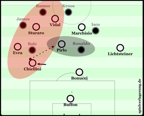 Για παράδειγμα, η βοήθεια που πήρε στο παιχνίδι με αντίπαλο τη Ρεάλ ήρθε από τον… Ρονάλντο και την… άρνησή του να μαρκάρει τον Ιταλό, παρότι τον είχε σχεδόν δίπλα του, όταν οι “μπιανκονέρι” ήταν κάτοχοι της μπάλας. Εβρά, Βιδάλ και Στεφάνο Στουράρο είχαν τραβηχτεί δεξιά, απασχολώντας τόσο τους ακραίους παίκτες της Ρεάλ, όσο και τον Μπέιλ, με συνέπεια να μείνει ένας παίκτης για να μαρκάρει αυτήν την μπαλιά του Πίρλο, από τον άξονα. Αυτός δεν μάρκαρε ποτέ και ως εκ τούτου, ο Ιταλός είχε τα απαιτούμενα δέκατα του δευτερολέπτου για να αρχίσει την επίθεση είτε με κοντινή πάσα στον οπισθοχωρημένο Κάρλος Τέβες είτε με βαθιά μπαλιά στην πλάτη του αντιπάλου στον Άλβαρο Μοράτα.
