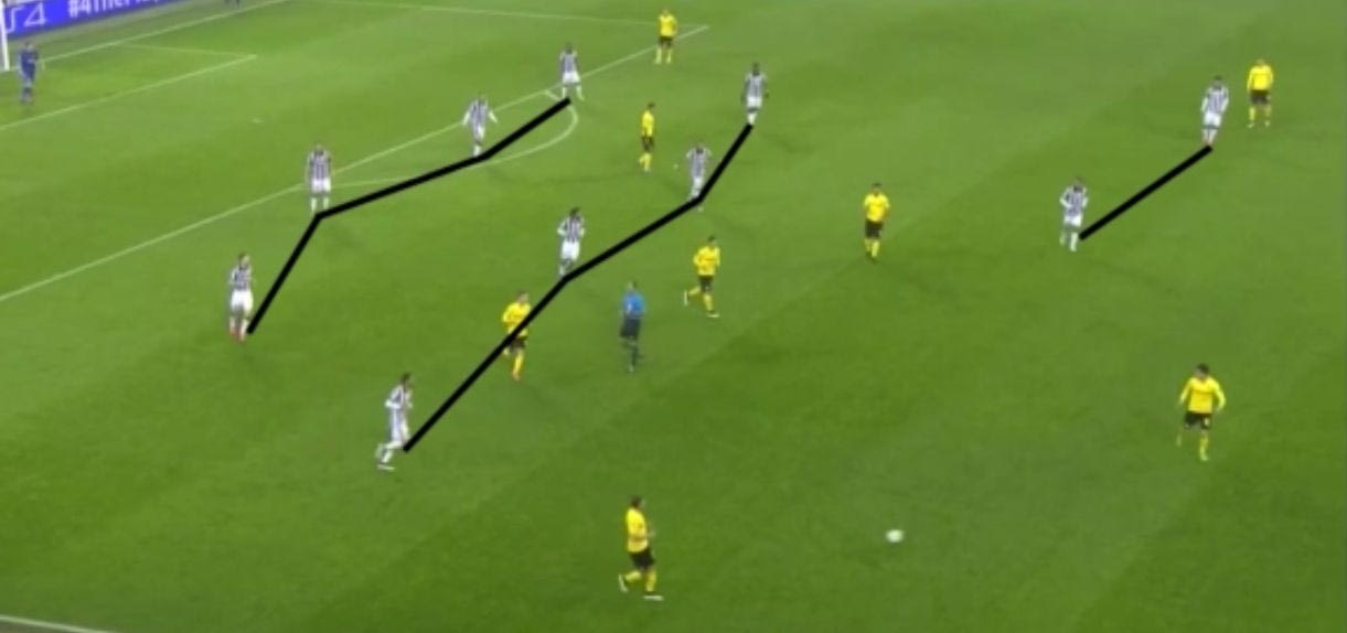 Απέναντι στην Ντόρτμουντ, σε σχηματισμό 4-3-1-2 που πλέον καθιερώνεται και σε ολόκληρη της Serie A, αντικαθιστώντας το 3-5-2, σήμα κατατεθέν των τελευταίων ετών, η Γιουβέντους άφησε την μπάλα στους Γερμανούς, οι οποίοι απαίδευτοι σε τέτοιες καταστάσεις, δεν μπορούσαν να την κυκλοφορήσουν σωστά για να διασπάσουν τον πολυφορτωμένο ιταλικό άξονα, ενώ δεν διέθεταν και υψηλά κορμιά για να γεμίσουν την περιοχή.