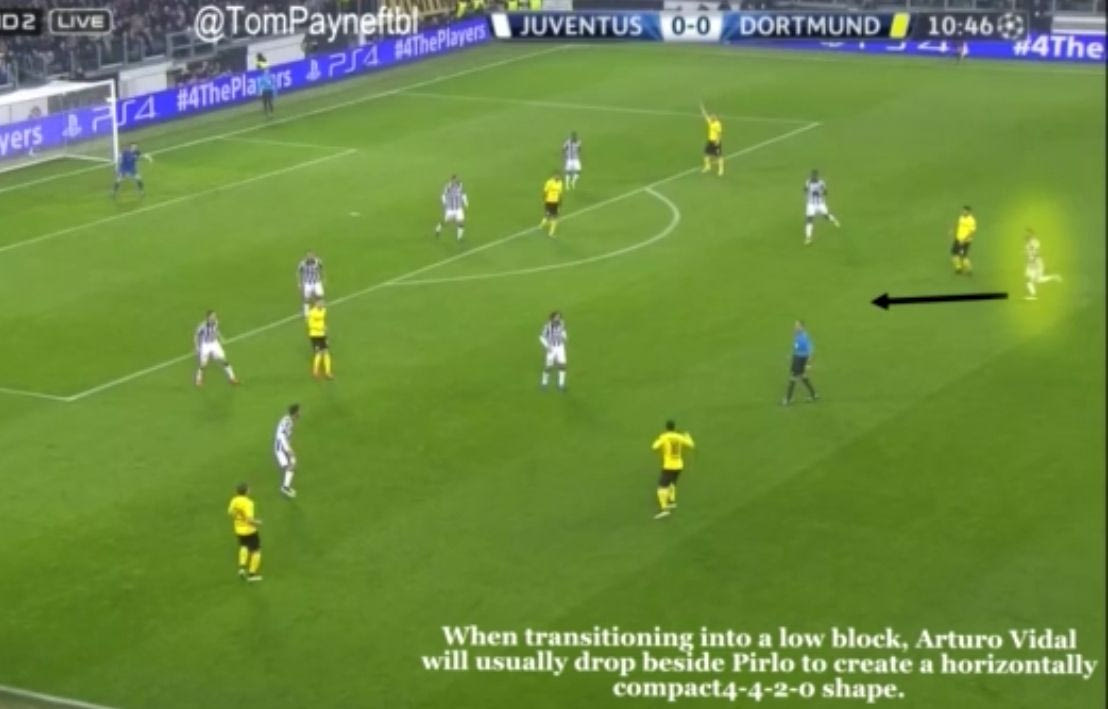 Γι’ αυτόν ακριβώς τον λόγο, όταν ο Αλέγκρι χρησιμοποιεί το 4-3-1-2, ο Αρτούρο Βιδάλ που παίζει τον ρόλο του υποστηρικτή της επίθεσης καταστρέφει τον “ρόμβο”, γυρίζει πίσω στο ύψος του Αντρέα Πίρλο και δημιουργεί ένα επίπεδο 4-4-2, δίνοντας τη δυνατότητα στους Κλάουντιο Μαρκίζιο (δεξιά) και Πολ Πογκμπά (αριστερά) να προσεγγίσουν τη γραμμή του πλαγίου, εφόσον χρειαστεί να καλύψουν κάποια εφόρμηση αντιπάλου μπακ που κάνει overlapping.