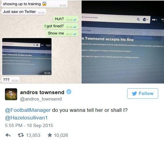 Ένα tweet που ανέφερε ότι ο Άντρος Τάουνσεντ απουσίασε από την προπόνηση της Τότεναμ, με συνέπεια να δεχθεί πρόστιμο, μπέρδεψε τη σύντροφό του αφού αυτό σχετιζόταν με το δημοφιλές videogame Football Manager.
