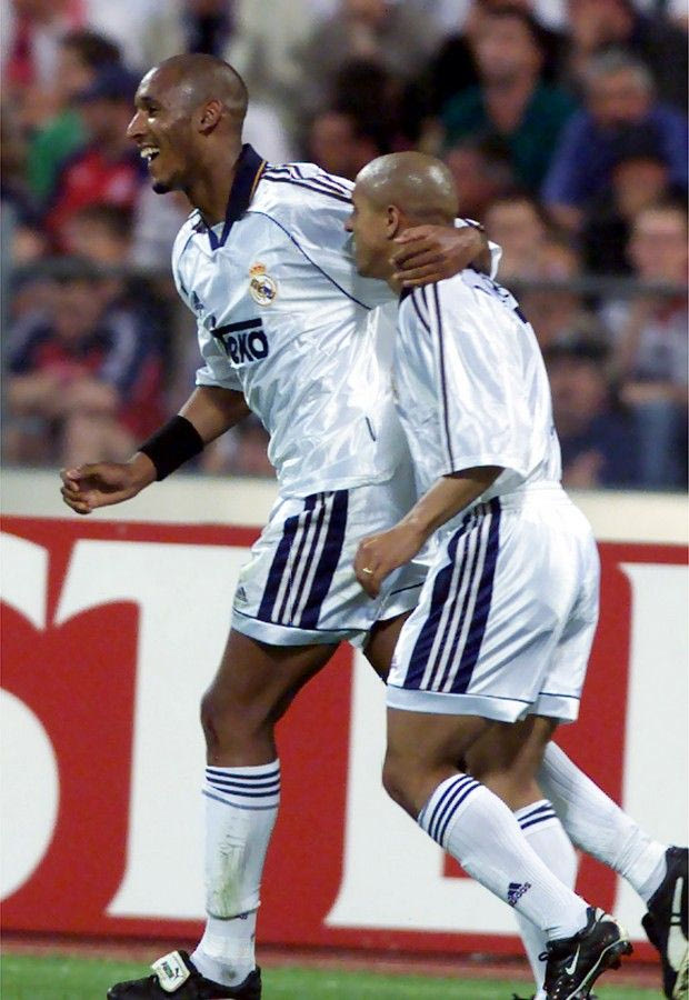 Nicolas Anelka, left, and Roberto Carlos of Real Madrid soccer club celebrate the 1-1 by Anelka vs FC Bayern Munich in their UEFA Champions League semifinal second leg match in Munich's Olympic stadium, Tuesday, May 9, 2000. (AP Photo/Camay Sungu) ASSOCIATED PRESS