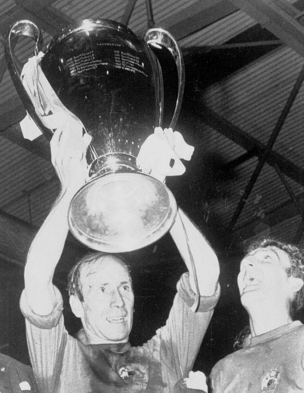 Manchester United captain Bobby Charlton holds aloft the European Cup watched by goalkeeper Alex Stepney, after United defeated Benfica 4-1 in the European Cup Final, at Wembley Stadium, England, May 29, 1968. (AP Photo/Pool) ASSOCIATED PRESS