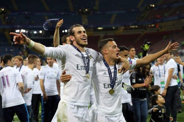 Real Madrid's Gareth Bale and Lucas Vazquez celebrate after the Champions League final soccer match between Real Madrid and Atletico Madrid at the San Siro stadium in Milan, Italy, Saturday, May 28, 2016. Real Madrid won 5-4 on pendata-alties after the match ended 1-1 after extra time. (AP Photo/Antonio Calanni) AP