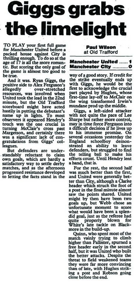 Ο… αγέραστος Γκιγκς είχε δηλώσει για την πρώτη του εμφάνιση στην βασική 11άδα: “Δεν περίμενα να είμαι στην ομάδα. Ο Σερ Άλεξ Φέργκιουσον διάβαζε τα ονόματα – Ντένις Ίργουιν, Στιβ Μπρους, Γκάρι Πάλιστερ – ήμουν τελευταίος γιατί ήμουν στα αριστερά. Πίστευα ότι ίσως να ήμουν μέσα γιατί υπήρχε περίπτωση να κάτσω στον πάγκο, αλλά μετά, και δεν θα το ξεχάσω ποτέ, είπε: ‘Ράιαν, θα παίξεις στα αριστερά’. Ξύπνησα. Ίδρωσαν οι παλάμες μου και σκέφτηκα: ‘Ναι σωστά, παίζω’. Ήταν κόντρα στην Σίτι στο Όλντ Τράφορντ αλλά ήμουν πολύ ενθουσιασμένος. Ήθελα να εντυπωσιάσω και να πάρω την ευκαιρία μου”.