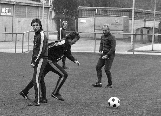 Ο Ούντο Λάτεκ (δεξιά) επιβλέπει την προπόνηση της Γκλάντμπαχ. Στην άσκηση οι Ντίτμαρ Ντάνερ και Χένιγνκ Γιένσεν, στο βάθος ο Γιουπ Χάινκες ASSOCIATED PRESS
