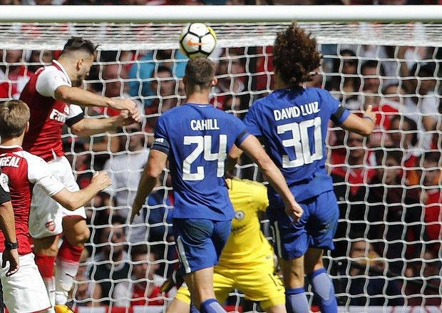 Arsenal's Sead Kolasinac, left, heads to score during the English Community Shield soccer match between Arsenal and Chelsea at Wembley Stadium in London, Sunday, Aug. 6, 2017. (AP Photo/Frank Augstein) AP