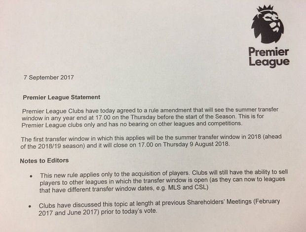 “Οι σύλλογοι της Premier League συμφώνησαν σήμερα να λήγει οποιαδήποτε καλοκαιρινή μεταγραφική περίοδο στις 17:00 τοπική ώρα ημέρα Πέμπτη πριν την έναρξη της σεζόν.