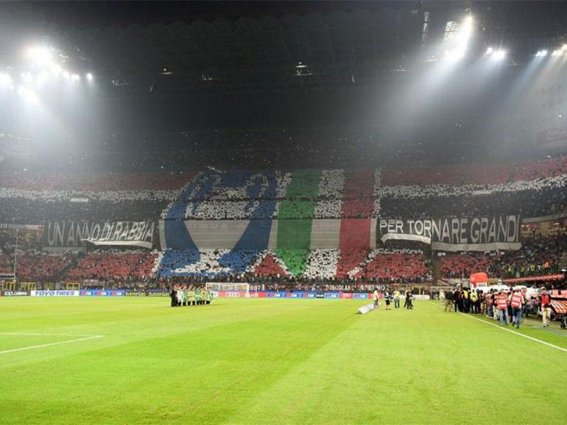 Στην κεντρική εξέδρα που βρίσκεται απέναντι από τα επίσημα σχηματίστηκε το πρώτο κορεό που έγραφε “We are Milan” (Είμαστε η Μίλαν).