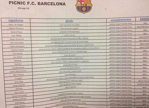 Μπορεί η Μπαρτσελόνα να στραβοπάτησε στην έδρα της Μάλαγα (0-0), ωστόσο αυτό δεν φαίνεται να έκοψε την… όρεξη των παικτών της ομάδας. Ισπανικό μέσο έφερε στη δημοσιότητα μια φωτογραφία με το μενού που διάλεξε ο κάθε παίκτης των “μπλαουγκράνα” αμέσως μετά το ματς.