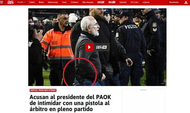 Αναφορά στην εισβολή του ιδιοκτήτη του ΠΑΟΚ στον αγωνιστικό χώρο αμέσως μετά την ακύρωση του γκολ του Βαρέλα κανει και η έτερη μαδριλένικη εφημερίδα As, μέσω της ιστοσελίδας της, με τον τίτλο της σχετικής είδησης να είναι η εξής: “Κατηγορούν τον πρόεδρο του ΠΑΟΚ ότι εκφόβισε με ένα πιστόλι τον διαιτητή την ώρα του αγώνα”.