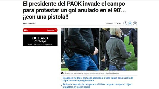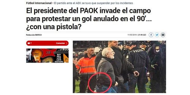 “Το παιχνίδι με την ΑΕΚ διεκόπη. Ο πρόεδρος του ΠΑΟΚ εισβάλλει στο γήπεδο για να διαμαρτυρηθεί για ένα γκολ που ακυρώθηκε στο 90’… με ένα πιστόλι;”, είναι ο τίτλος της Marca στη διαδικτυακή της έκδοση (είναι δεύτερο θέμα), με το σχετικό κείμενο να αναφέρει το εξής: