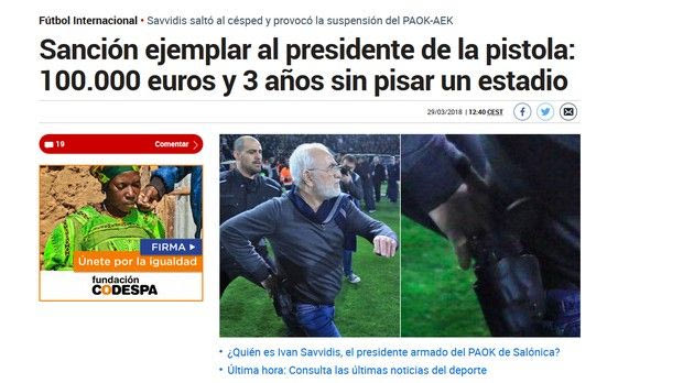 Η απόφαση του αθλητικού δικαστή να τιμωρήσει τον Ιβάν Σαββίδη με απαγόρευση εισόδου στα γήπεδα για τα επόμενα τρία χρόνια, ελέω της εισβολής του ως “ταύρος εν υαλοπωλείο” στον αγωνιστικό χώρο στο φινάλε του ντέρμπι με την ΑΕΚ, δεν ήταν δυνατόν να μην σχολιαστεί από τα ισπανικά ΜΜΕ.