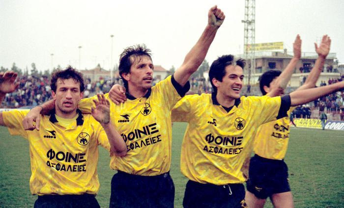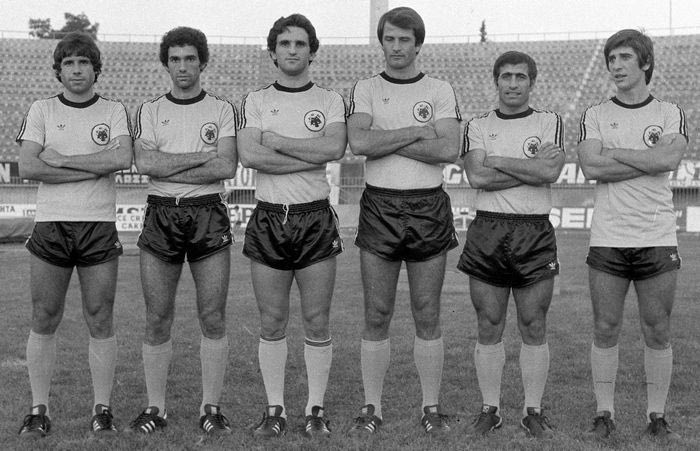 Ο Δικέφαλος και η γραμματοσειρά στο καινούργιο σήμα της ΑΕΚ (αυτό του 1993 δηλαδή) προϋπήρχε. Έκανε για πρώτη φορά την εμφάνισή την περίοδο που ο Λουκάς Μπάρλος είχε συμφωνήσει με την Αdidas στα τέλη της δεκαετίας του ’70, ωστόσο τότε βρισκόταν σε στρογγυλό πλαίσιο, όπως μπορεί κανείς να διαπιστώσει στην παρακάτω φωτογραφία…