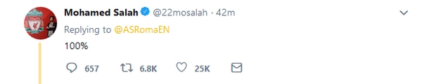 Φυσικά, μην νομίζετε πως η σχέση των δύο πλευρών έχει διαταραχθεί. Ίσα-ίσα, Ρόμα και Σαλάχ διατηρούν άριστες σχέσεις (φάνηκε και σε πρόσφατο σχόλιό του σε τιτίβισμα του Ναϊνγκολαν, με αφορμή το γκολ του Μανωλά κόντρα στην Μπαρτσελόνα) και αυτό αποδείχτηκε λίγα λεπτά μετά την κλήρωση όπου η Ρόμα έγραψε στον επίσημο (αγγλικό) λογαριασμό της στο Twitter: