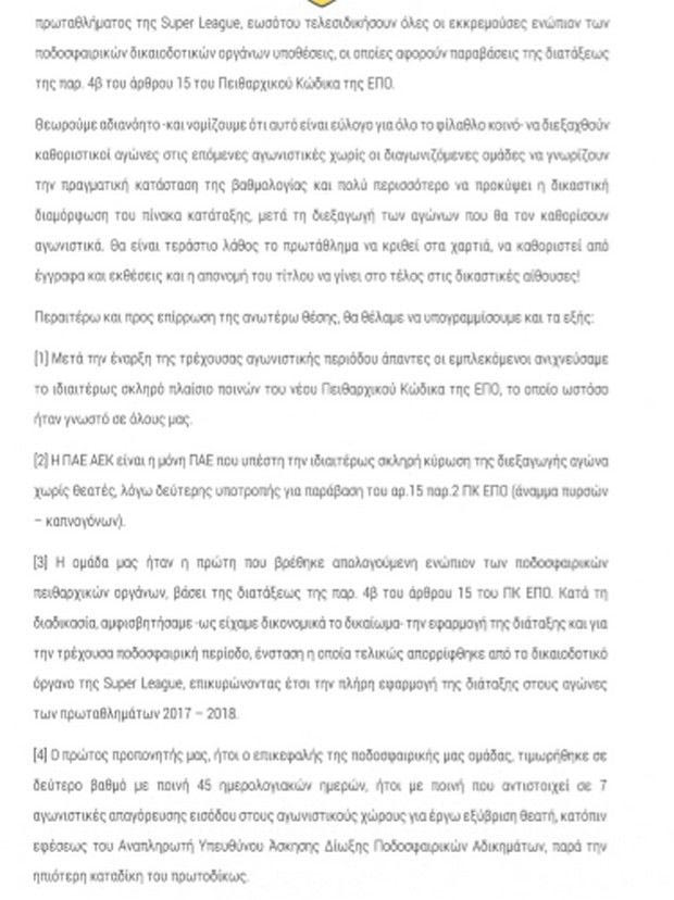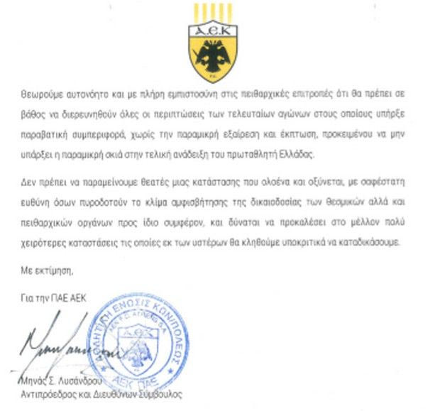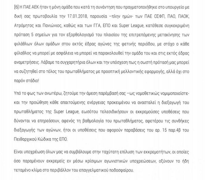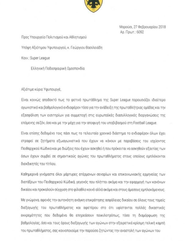 Η ΠΑΕ ΑΕΚ, με επιστολή της προς τον Υφυπουργό Αθλητισμού, Γιώργο Βασιλειάδη ζήτησε τη διακοπή του πρωταθλήματος μέχρι να ξεκαθαρίσουν όλες οι εκκρεμείς υποθέσεις στην ποδοσφαιρική δικαιοσύνη.