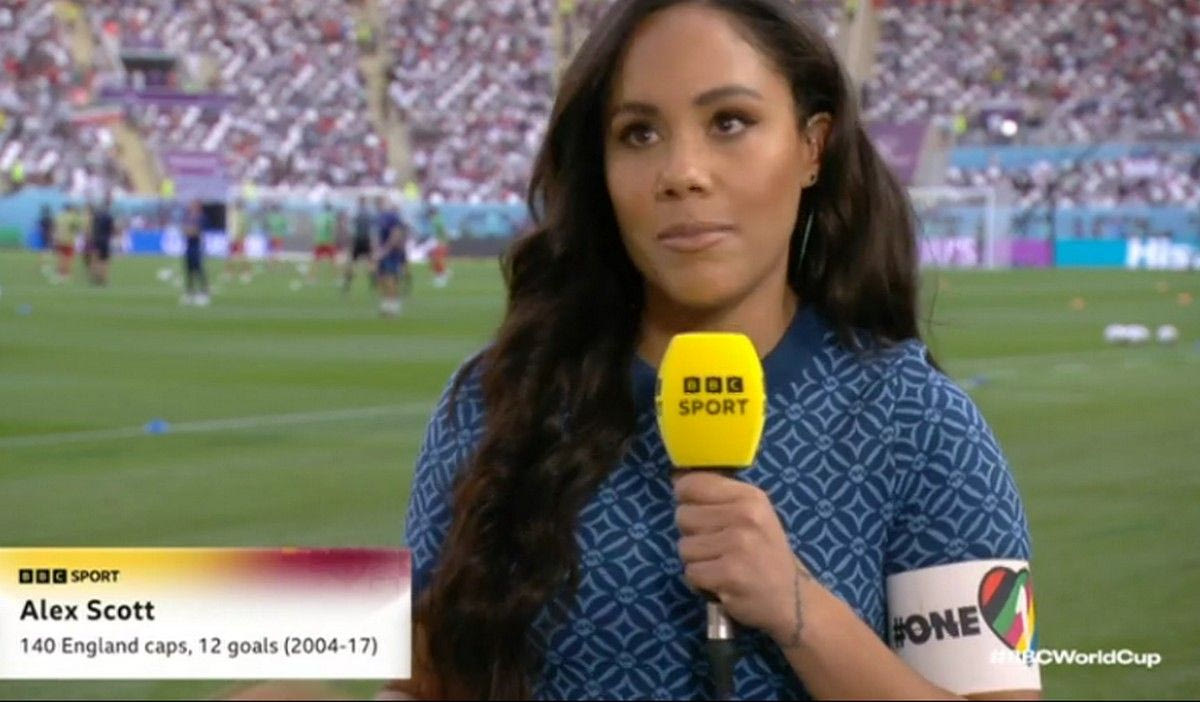 Η παλαίμαχος θρύλος του ποδοσφαίρου που δουλεύει πλέον ως δημοσιογράφος του BBC, Άλεξ Σκοτ, εμφανίστηκε από το Κατάρ ζωντανά φορώντας το περιβραχιόνιο στήριξης στην ΛΟΑΤΚΙ κοινότητα για την καμπάνια OneLove.