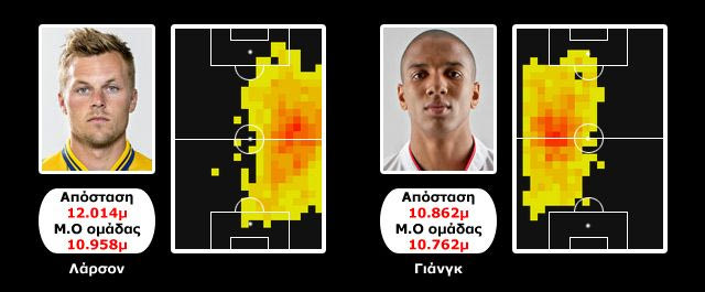 • Εκεί που Χόγκσον άλλαξε εντολές σε σχέση με το προηγούμενο παιχνίδι ήταν στις θέσεις των πλάγιων του κέντρου. Τους τοποθέτησε ως εσωτερικούς μέσους για να μειωθεί το πλάτος του παιχνιδιού, να είναι κοντά στα δύο σέντερ φορ και με κάθετες κινήσεις να μπαίνουν στην περιοχή, να δίνουν διαδρόμους για την προώθηση των πλάγιων αμυντικών Τζόνσον και Κόουλ. Κατάφερε να κόψει την κυκλοφορία της μπάλας και την καλή οργάνωση του παιχνιδιού από τους Σουηδούς και έκανε την ομάδα του πιο επιθετική.