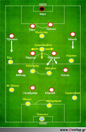 • Ο Ιμπραΐμοβιτς σε ρόλο οργανωτή- επιθετικού. Λόγω της σωστής πίεσης των Άγγλων χρειάστηκε να κατεβεί χαμηλά να πάρει μπάλα κάτι που έκανε τις αποστάσεις κέντρου και επίθεσης μεγάλες . Αποτέλεσμα αυτού να μην μπορεί να απειλήσει η ομάδα του αλλά και ο ίδιος ειδικά στο πρώτο ημίχρονο.