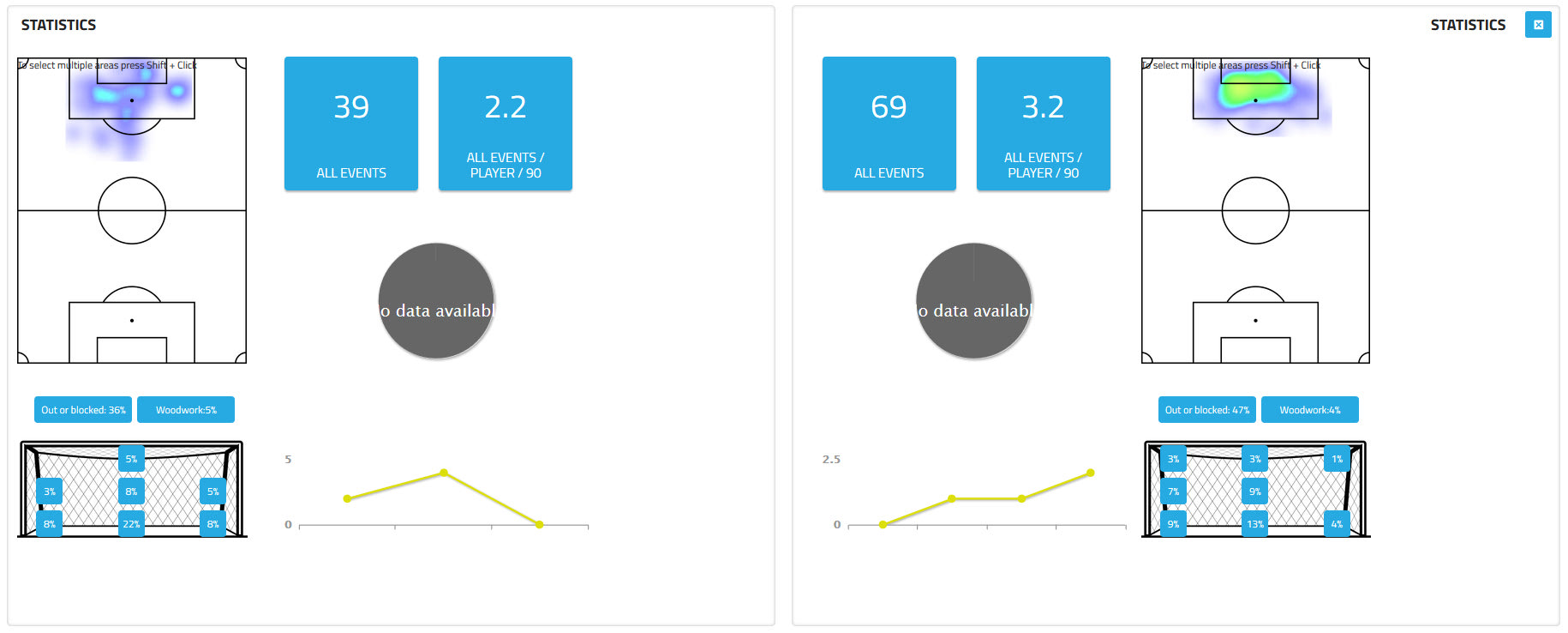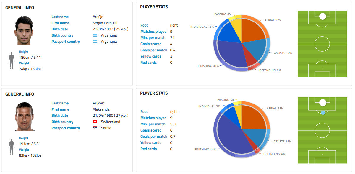Με τον Αλεξάνταρ Πρίγιοβιτς να μετρά περισσότερους αγώνες μέσα στην σεζόν (η στατιστική απεικόνιση αφορά την δράση και των δυο από την έναρξη του πρωταθλήματος) είναι λογικό ο Σέρβος να έχει σχεδόν διπλάσιες ευκαιρίες για γκολ έναντι του Αργεντινού, και συγκεκριμένα 69 έναντι 39. Ο θερμικός χάρτης καταγράφει και τη διαφορά στο παιχνίδι των δυο παικτών, που βέβαια έχει να κάνει και με το σωματότυπό τους. Ο Αραούχο, πιο κινητικός και πιο ευέλικτος, έχει καταγράψει “πατήματα” και εκτός μεγάλης περιοχής, αλλά και στις δυο περιοχές μπροστά από τις γωνίες της μικρής περιοχής. Ο Πρίγιοβιτς από την πλευρά του κινείται στον χώρο που βρίσκεται μπροστά και πίσω από τη γραμμή της μικρής περιοχής. Όσον για το μέρος της εστίας στο οποίο στέλνουν τη μπάλα, ο Πρίγιοβιτς, λόγω ύψους και κεφαλιών, την έχει στείλει και στο “Γ” τόσο της αριστερής όσο και της δεξιάς πλευράς. Το 22% των τελειωμάτων του Αραούχο πηγαίνει χαμηλά και στο κέντρο της εστίας, ενώ το αντίστοιχο του Πρίγιοβιτς είναι στο 13%.