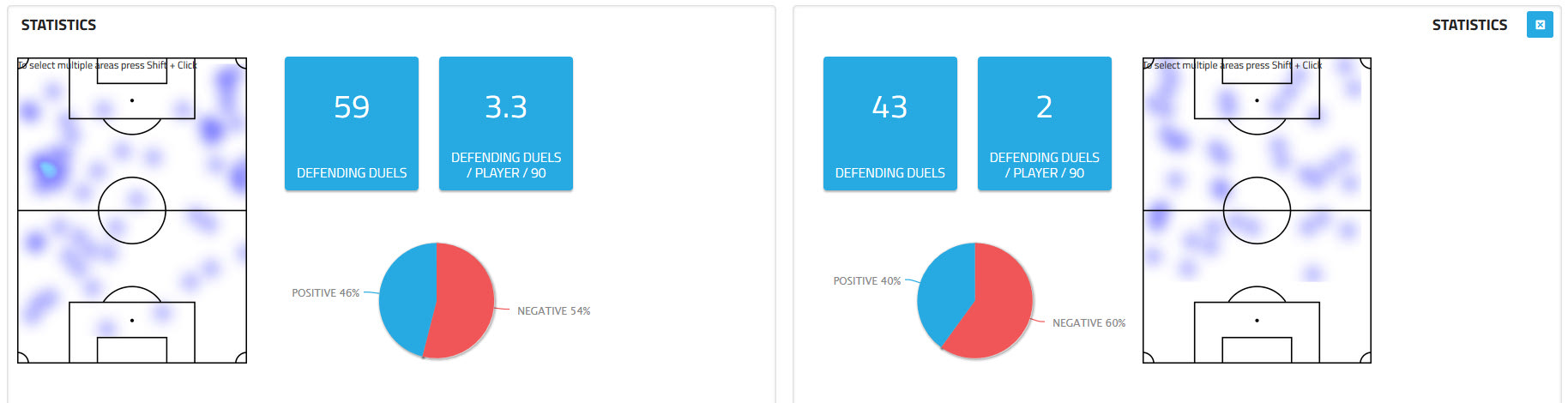 Δεν περίμενε κανείς και πολλά σε αυτό το τομέα από κανέναν από τους δυο, αν και η πίεση ψηλά είναι κάτι που ζητούν όλοι οι προπονητές από τους επιθετικούς τους. Βέβαια, σε αυτό το τομέα, καταγράφονται συνολικά οι φορές που επιχείρησαν να επανακτήσουν την κατοχή για την ομάδα τους. Για τον Σέρχιο Αραούχο έχουν καταγραφεί 59 αμυντικές μονομαχίες με ποσοστό επιτυχίας στο 46% και για τον Αλεξάνταρ Πρίγιοβιτς 43 με ποσοστό επιτυχίας στο 40%.
