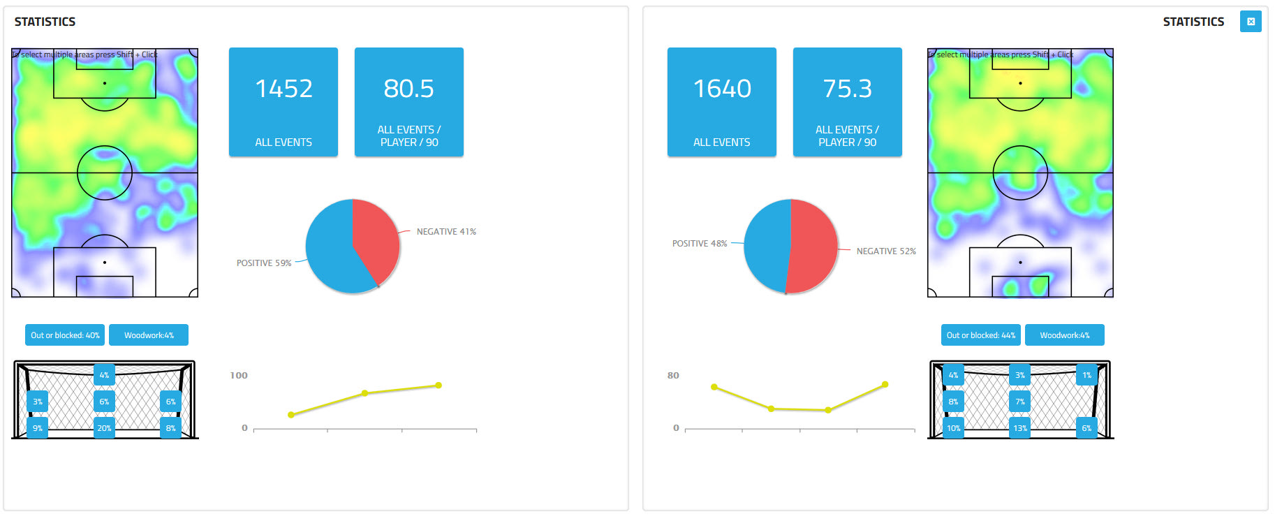 Οι καταγεγραμμένες με βάση την στατιστική ενέργειες του Σέρχιο Αραούχο στα παιχνίδια είναι 1452 και του Αλεξάνταρ Πρίγιοβιτς είναι 1640, με τον Αργεντινό να έχει όμως μεγαλύτερο μέσο όρο ανά 90 λεπτά παιχνιδιού (90,5 έναντι 75,3) καθώς συνολικά μέσα στην σεζόν ο επιθετικός της Ένωσης έχει λιγότερο χρόνο συμμετοχής από τον επιθετικό των ασπρόμαυρων. Μεγαλύτερο είναι και το συνολικό ποσοστό επιτυχίας για τον Αραούχο, καθώς είναι στο 59% έναντι 48% του Πρίγιοβιτς. Ο θερμικός χάρτης που “συνοδεύει” την συγκεκριμένη καταγραφή, αποτυπώνει και το χώρο στον οποίο έχουν γίνει όλες αυτές οι ενέργειες, είτε αφορούν τον επιθετικό είναι τον αμυντικό τομέα. Ο Αραούχο κινείται κυρίως προς την αριστερή πλευρά, ενώ από την πλευρά του ο Πρίγιοβιτς δεν δείχνει να έχει προτίμηση. Στην χάρτη καταγράφεται και η αμυντική συνεισφορά του Πρίγιοβιτς στα κόρνερ, καθώς υπάρχει κινητικότητα (που καταγράφεται με το πράσινο χρώμα) στην μικρή περιοχή της άμυνας, εκεί που ο Σέρβος με το ύψος του δίνει βοήθειες.