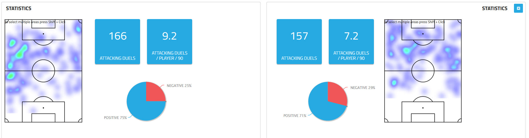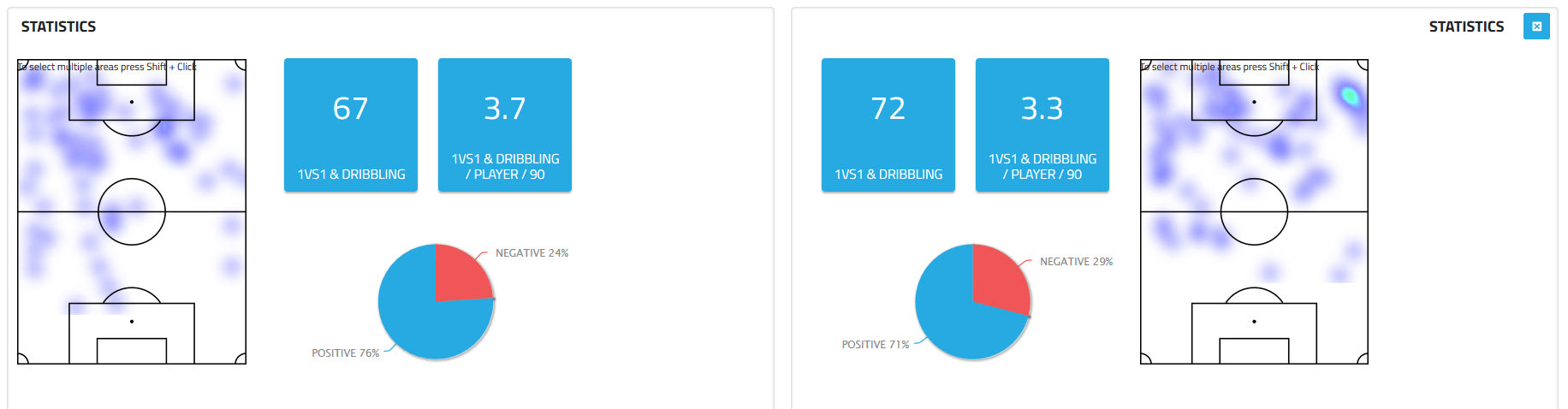 Παρόμοια και υψηλά είναι τα ποσοστά επιτυχίας των δυο επιθετικών στις μονομαχίες “ένας εναντίον ενός”. Ο θερμικός χάρτης δείχνει ότι τέτοιες προσπάθειες έχουν καταγράψει αμφότεροι στα 3/4 του γηπέδου, με τον Αραούχο να έχει 67 και ποσοστό επιτυχίας στο 76% και τον Πρίγιοβιτς να έχει 72 και ποσοστό επιτυχίας στο 71%.