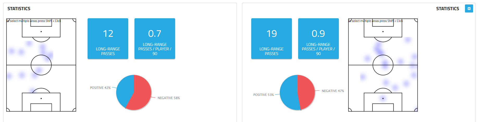 Στις μακρινές πάσες, αυτό που αλλάζει δεν είναι η διαφορά στον αριθμό ανάμεσα στους δυο (καθώς και πάλι ο Αραούχο έχει λιγότερες σε σχέση με τον Πρίγιοβιτς, και συγκεκριμένα δώδεκα έναντι 19) αλλά το ποσοστό επιτυχίας, με αυτό του Αραούχο να είναι στο 42% και το αντίστοιχο του Πρίγιοβιτς στο 53%.