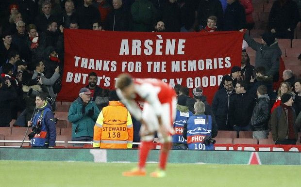 Arsenal's Alex Oxlade-Chamberlain reacts as Arsenal fans hold up a banner after the Champions League round of 16 second leg soccer match between Arsenal and Bayern Munich at the Emirates Stadium in London, Tuesday, March 7, 2017. Arsenal lost the match 5-1 and 10-2 on aggregate. (AP Photo/Frank Augstein) AP