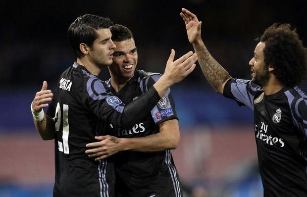 Real Madrid's Alvaro Morata, left, celebrates with Pepe and Marcelo, right, after scoring his side's third goal during the Champions League round of 16, second leg, soccer match between Napoli and Real Madrid at the San Paolo stadium in Naples, Italy, Tuesday March 7, 2017. (AP Photo/Andrew Medichini) AP