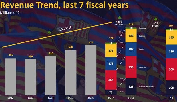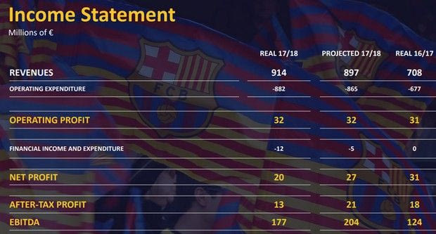 Έναν χρόνο μετά από έναν ισολογισμό ρεκόρ, εκείνο του 2016-2017, οι Καταλανοί ξεπέρασαν ξανά τον εαυτό τους, συνεχίζοντας την ανοδική πορεία για 7η σερί σεζόν. Από τα 608.000.000 ευρώ του 2014-2015, μέσα σε τρία έτη, τα έσοδα εκτοξεύθηκαν στα 914.00.000 ευρώ και μάλιστα περίπου 17.000.000 πιο πάνω από τον περσινό προϋπολογισμό. Το ποσό αυτό συνιστά αύξηση 29% σε σχέση με το προηγούμενο οικονομικό έτος, όταν η Μπαρτσελόνα είχε βάλει στα ταμεία της 708.000.000 ευρώ. Χαρακτηριστικό είναι ότι τη σεζόν 2012-2013 είχε μόλις 490.000.000 ευρώ.