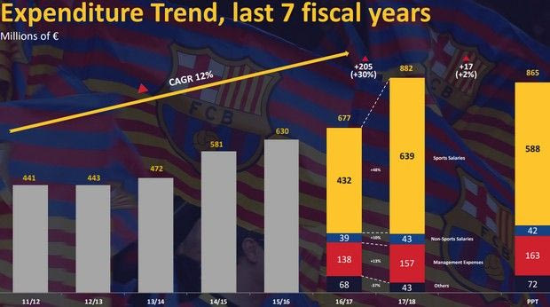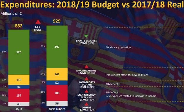 Αντίστοιχα ανοδική πορεία ακολούθησε και ο τομέας των εξόδων της Μπαρτσελόνα. Ο σύλλογος σημείωσε ρεκόρ, ξεπερνώντας κι εδώ το ένα δισεκατομμύριο δολάρια. Συγκεκριμένα, από τα ταμεία της ομάδας βγήκαν 882.000.000 ευρώ, ποσό μεγαλύτερο κατά 2% από τον προϋπολογισμό και κατά 205.000.000 ευρώ σε σχέση με τα έξοδα του 2016-2017.