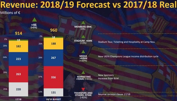 Ακόμα κι έτσι, τη νέα χρονιά οι άνθρωποι της Μπαρτσελόνα έχουν προϋπολογίσει νέα κερδοφορία, αφού προσβλέπουν σε 960.000.000 ευρώ έσοδα, με σημαντική αύξηση 20% στα δικαιώματα προβολής λόγω της νέας, βελτιωμένης συμφωνίας της UEFA για τον κύκλο 2018-2021 του Champions League. Επιπροσθέτως, υπολογίζεται ραγδαία αύξηση των εμπορικών εσόδων κατά 35%, εξαιτίας της νεοσύστατης Barça Licensing and Merchandising, της εταιρίας που διαχειρίζεται πλέον τα εμπορικά δικαιώματα του συλλόγου.
