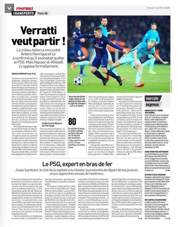 Όπως αποκάλυψε η “Equipe”, ο 24χρονος Ιταλός διεθνής μέσος ενημέρωσε τον νέο αθλητικό διευθυντή της Παρί, Αντέρο Ενρίκε, πως επιθυμεί να κλείσει τώρα ο κύκλος του στην ομάδα και σύμφωνα με δημοσίευματα σε Γαλλία και Ιταλία, η Μπαρτσελόνα δεν χάνει χρόνο και αναμένεται την Δευτέρα (12/6) να κάνει πρόταση ύψους 100.000.000 ευρώ για τον αποκτήσει.