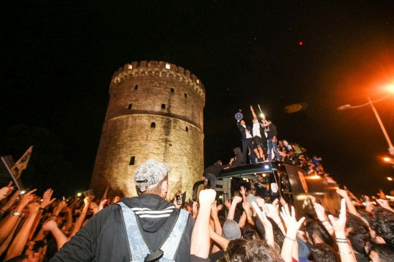 Ακολούθως έκανε την εμφάνισή του στον Λευκό Πύργο, εκεί που το υποδέχθηκαν περίπου 7.000 φίλοι του ΠΑΟΚ, στις 4:30 τα ξημερώματα και έκαναν τη νύχτα μέρα με πυρσούς και βεγγαλικά έχοντας στήσει… “επιτροπή υποδοχής”.