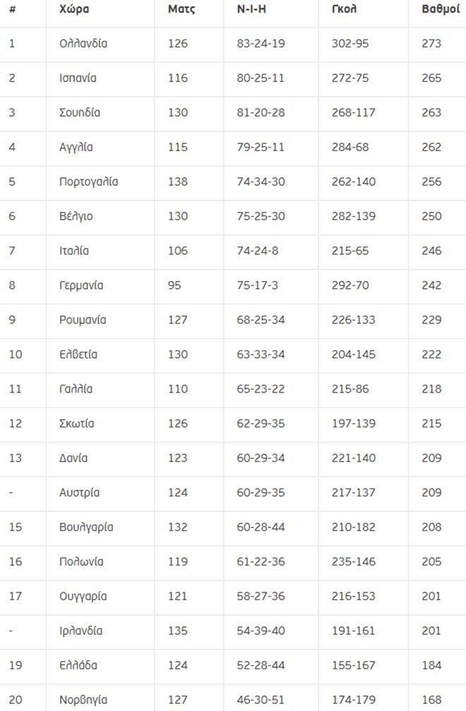 Η χώρα μας βρίσκεται εδώ και καιρό σε αυτήν τη θέση και μοιάζει δύσκολο τόσο να ανέβει, όσο και να υποχωρήσει. Η Ιρλανδία που βρίσκεται στη 18η θέση έχει 201 βαθμούς (από 135 αγώνες), ενώ η Νορβηγία που βρίσκεται κάτω από την Ελλάδα έχει 168 βαθμούς (σε 127 αγώνες). Αξίζει να σημειωθεί, πάντως, πως η χώρα μας είναι η πρώτη της κατάταξης των 64 εθνικών ομάδων που έχουν συμμετάσχει σε προκριματικά ευρωπαϊκής ζώνης από το 1934 (η διοργάνωση του 1930 διεξήχθη με προσκλήσεις) μέχρι σήμερα που έχει αρνητική διαφορά τερμάτων (155-167, -12).