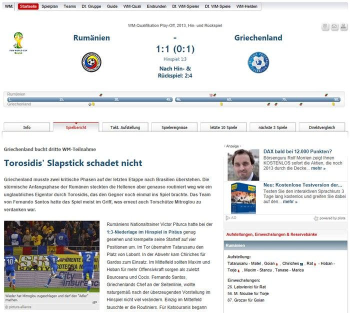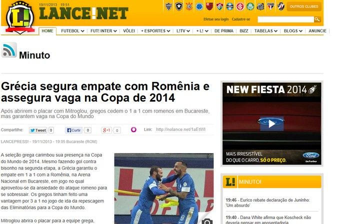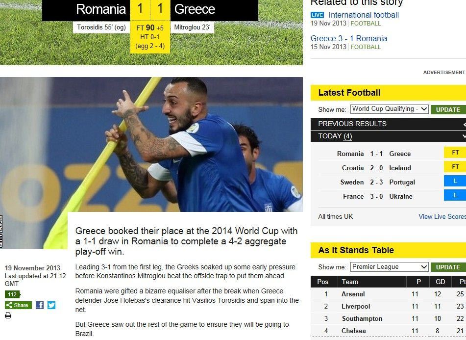 “Η Ελλάδα κράτησε την ισοπαλία με τη Ρουμανία κι εξασφάλισε θέση στο Παγκόσμιο Κύπελλο 2014. Ο Μήτρογλου άνοιξε το σκορ, οι Ρουμάνοι ισοφάρισαν, αλλά οι Έλληνες κράτησαν το 1-1 που τους εγγυήθηκε την παρουσία στο Παγκόσμιο Κύπελλο”.