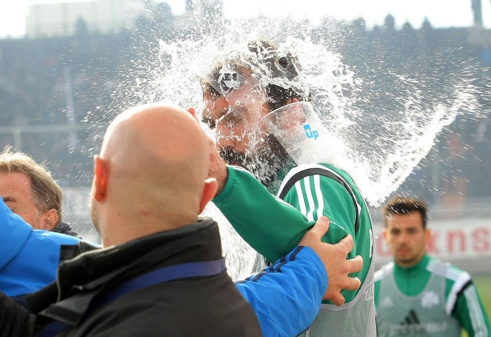 Ο Γιώργος Κουτρουμπής δέχεται ποτήρια γεμάτα νερό από οπαδούς του ΟΦΗ και ο φακός πιάνει την επίμαχη φάση, όπως μπορείτε να διαπιστώσετε από την παρακάτω φωτογραφία.