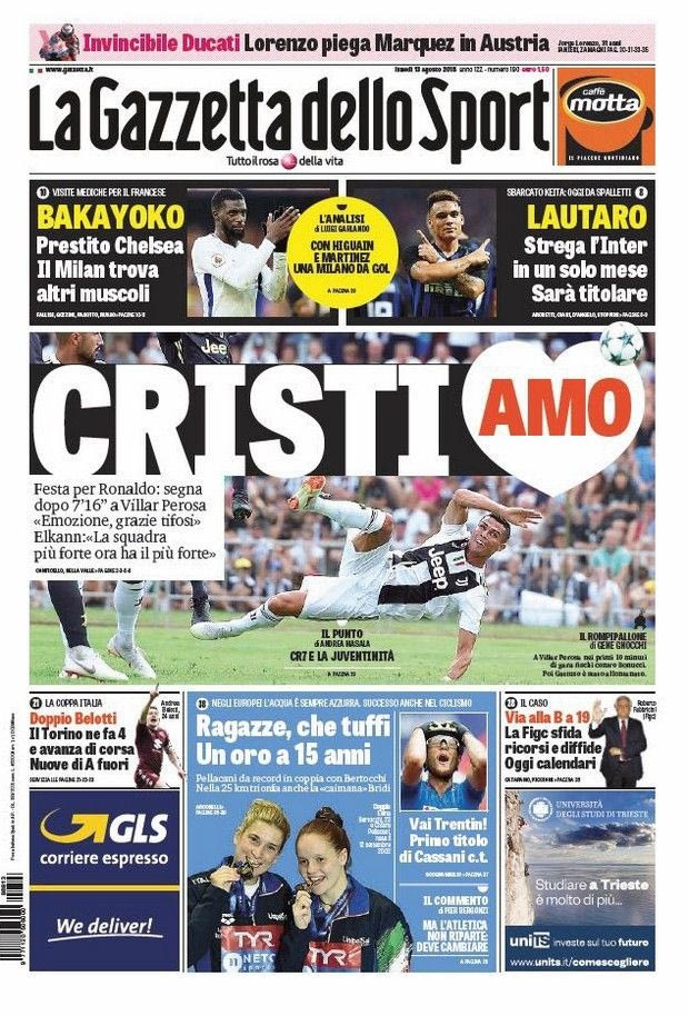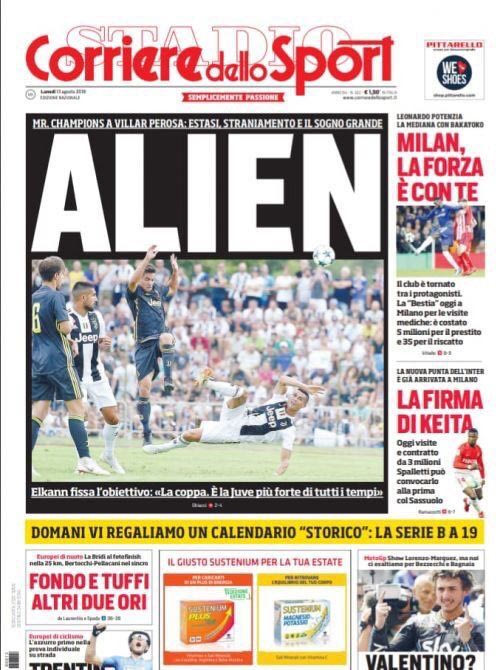 Φυσικά αναφορά στον 33χρονο σούπερ σταρ είχαν και οι άλλες δύο μεγάλες αθλητικές εφημερίδες της Ιταλίας, με την “Tuttosport” να έχει τίτλο “Ronaldissimo” (“Πολύς Ροναλντο”) και την “Corriere dello Sport” να τιτλοφορείται: “Alien” (“Εξωγηινός”)…