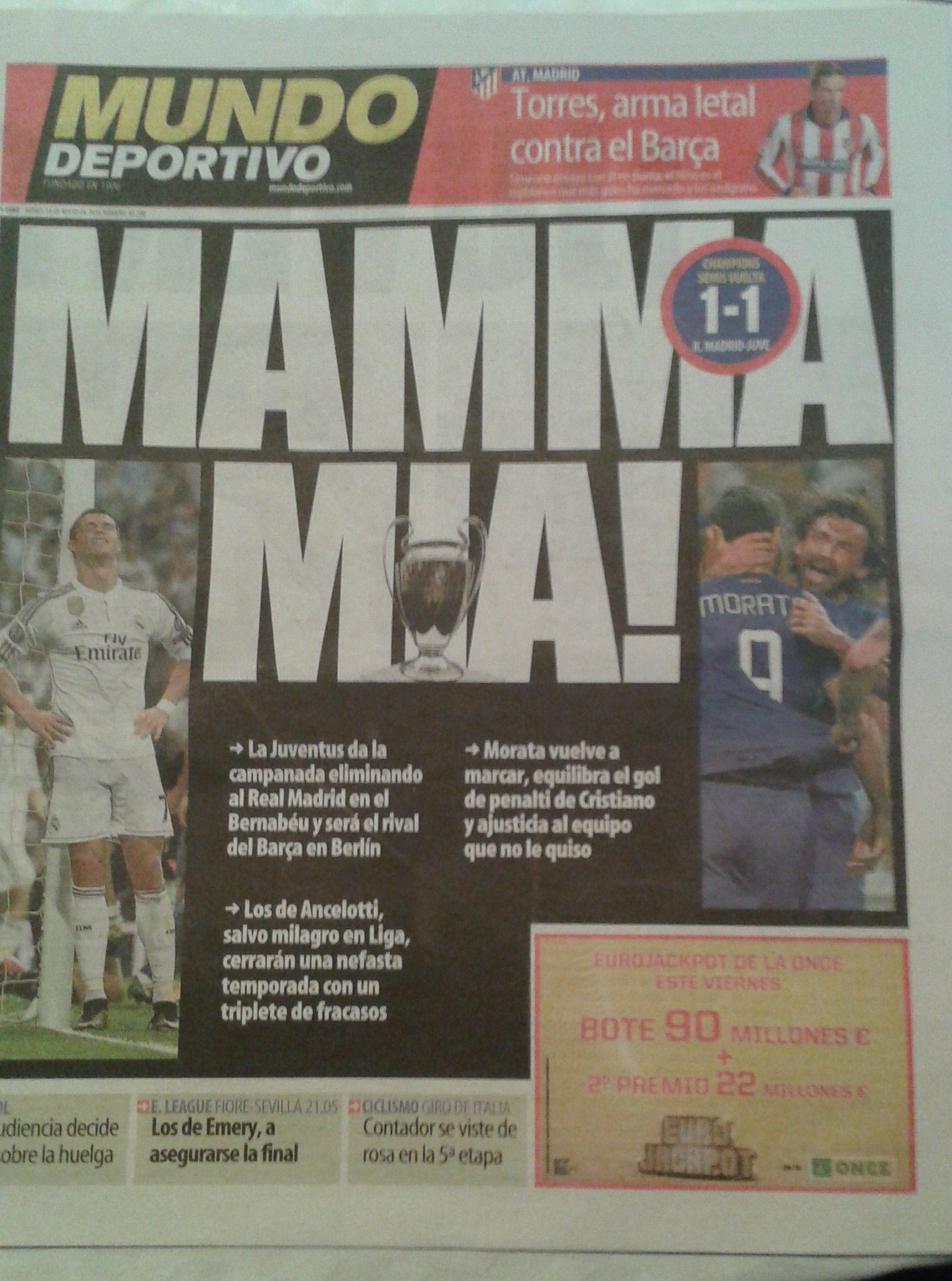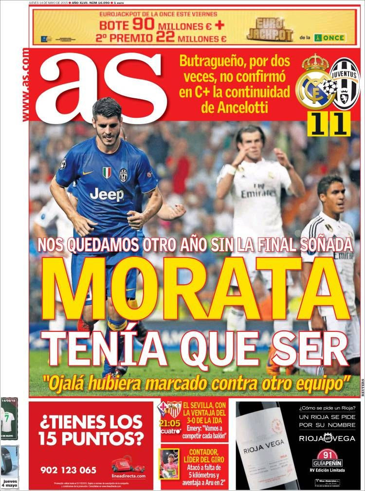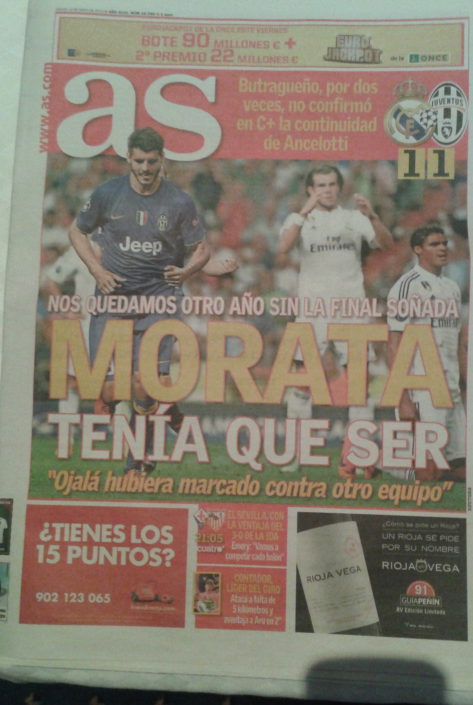 Την είδηση πάντως της ημέρας την δίνει ηAs.Ο Εμίλιο Μπουτραγκένιο, αν και ρωτήθηκε δύο φορές από τοCANAL+ αρνήθηκε να τοποθετηθεί για το αν ο Κάρλο Αντσελότι συνεχίσει στον πάγκο των “μερένγκες” και του χρόνου. Κατά τα άλλα ο τίτλος είναι “ο Μοράτα που θα έπρεπε να είναι” με τη δήλωση του Ισπανού φορ: “Μακάρι να σκόραρα εναντίον άλλης ομάδας”.