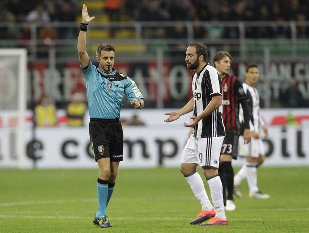 Juventus' Gonzalo Higuain reacts as referee Nicola Rizzoli disallowed juventus' goal, during a Serie A soccer match between AC Milan and Juventus, at the San Siro stadium in Milan, Italy, Saturday, Oct. 22, 2016. (AP Photo/Luca Bruno) AP