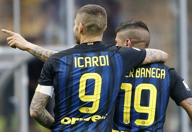 Inter Milan's Ever Banega, right, celebrates with his teammate Mauro Icardi after scoring during the Serie A soccer match between Inter Milan and Atalanta at the San Siro stadium in Milan, Italy, Sunday, March 12, 2017. (AP Photo/Antonio Calanni) AP