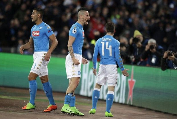 Napoli's Marek Hamsik, center, celebrates after Dries Mertens, right,scored the opening goal during the Champions League round of 16, second leg, soccer match between Napoli and Real Madrid at the San Paolo stadium in Naples, Italy, Tuesday March 7, 2017. (AP Photo/Andrew Medichini) AP