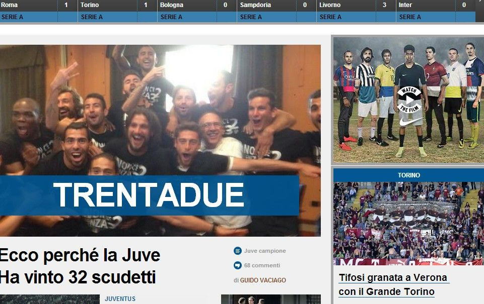Στα χαρτιά η Γιουβέντους στέφθηκε πρωταθλήτρια για 30ή φορά στην ιστορία της, ωστόσο οι "μπιανκονέρι" έχουν εδώ και 8 χρόνια διαφορετική άποψη και κάθε φορά πανηγυρίζουν... δύο πρωταθλήματα περισσότερα. Ως εκ τούτου, φέτος πανηγύρισαν το 32ο σκουντέτο.