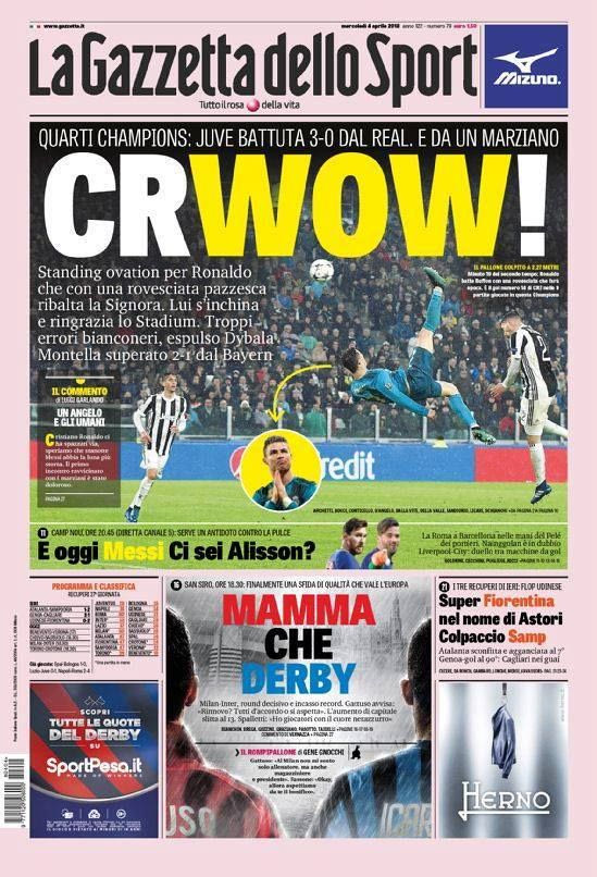 Παρά το γεγονός, όμως, ότι οι “μερένγκες” έβαλαν… ταφόπλακα στα όνειρα της “μεγάλης κυρίας” για πρόκριση στα ημιτελικά του Champions League, η ιταλική εφημερίδα “Gazzetta dello Sport”… υποκλίθηκε στον CR7 και κυκλοφόρησε στο σημερινό (4/4) της πρωτοσέλιδο με τίτλο: “CRWOW!”.